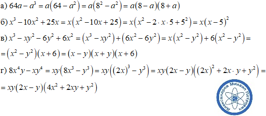 Разложите на множители: а)64a-a^3 б)x^3-10x^2+25x в)x^3-xy^2-6y^2+6x^2 г)8x^4y-xy^4