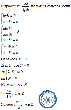 При каких значения t не имеет смысла выражение: корень из 3/tg5t