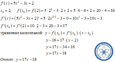Напишите уравнение косательной к графику функций f(x)=5x2-3x+2 в точке с абциссой х0=2