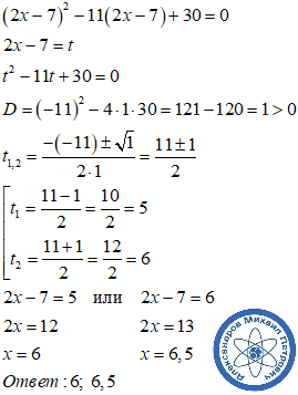 Решите уравнение,используя метод введения новой переменной (2x-7)2-11(2x-7)+30=0