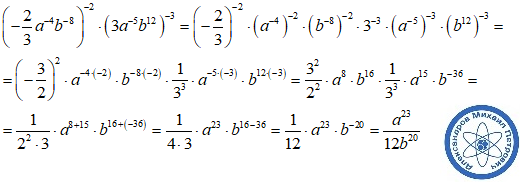 Преобразовать выражение так,чтобы оно не содержало степени с отрицательным показателем (-2/3а^-4*b^-8)^-2 *(3a^-5*b^12)^-3