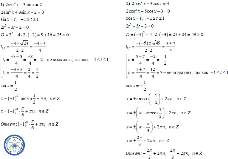 2sin^2x+3sinx=2 2cos^2x-5cosx=3
