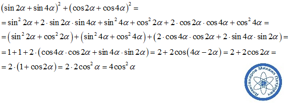 Докажите тождество: (sin2a + sin4a)^2 + (cos2a + cos4a)^2 = 4cos^2a