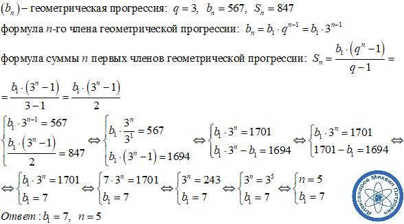 Геометрическая прогрессия q=3 bn=567 sn=847 найти: b1 n
