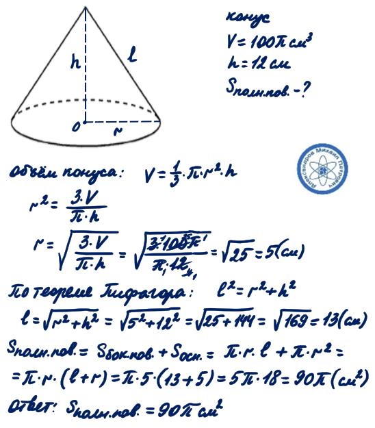 Объем конуса равен 100П см(кубических),а высота 12 см. Вычислите площадь полной поверхности конуса.