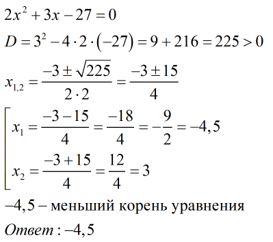 2х^2+3х-27=0 решите квадратное уравнение и найдите его меньший корень.