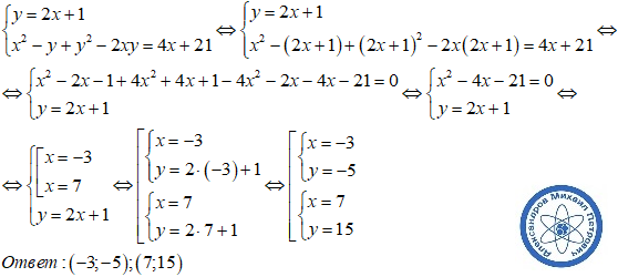 Решите систему уравненийy=2x+1x^2-y+y^2-2xy=4x+21