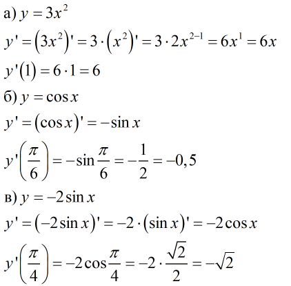 Найдите производную функции в точке х0 а) у = 3х^2, х0 = 1 б) у = cos x , x0 = p/6 в) y = -2 sin x , x0 = p/4