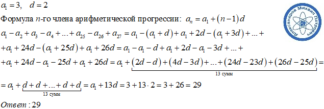 В арифметической прогрессии a1=3 и d=2.Вычислите a1-a2+a3-a4+...+a25-a26+a27