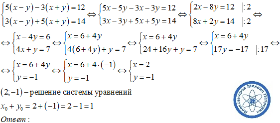 Если (x0; y0) - решение системы уравнений 5(x-y)-3(x+y)=12 3(x-y)+5(x+y)=14 то значение выражения x0+y0 равно