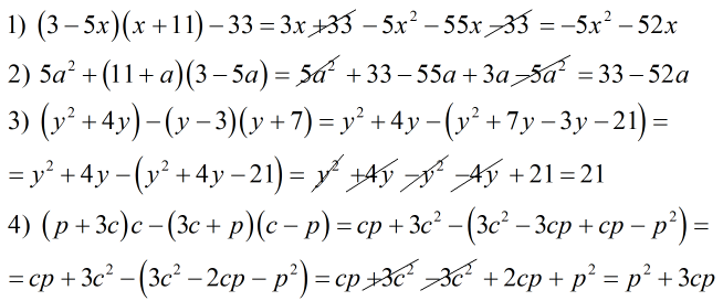 Упростите выражение 1. (3-5x)(x+11)-33 2 5a^2+(11+a)(3-5a) 3 (y^2+4y)-(y-3)(y+7) 4 (p+3c)c-(3c+p)(c-p)