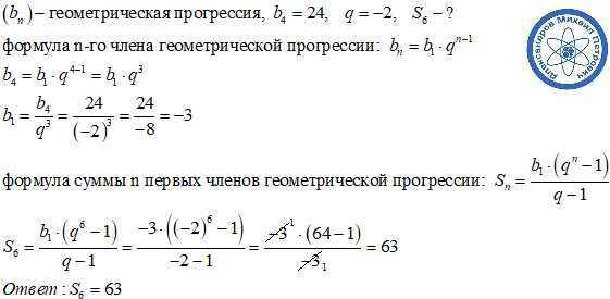 Найти сумму первых шести членов геометрической прогрессии ( bn),если и b4=24,а знаменатель q= - 2