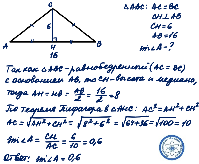 В треугольнике ABC AC=BC, высота CH=6, AB=16 найдите синус угла A