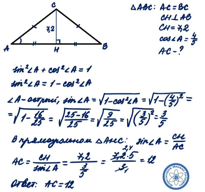 В треугольнике ABC AC = BC, высота CH равна 7,2 и cosA=4/5 . Найдите AC.