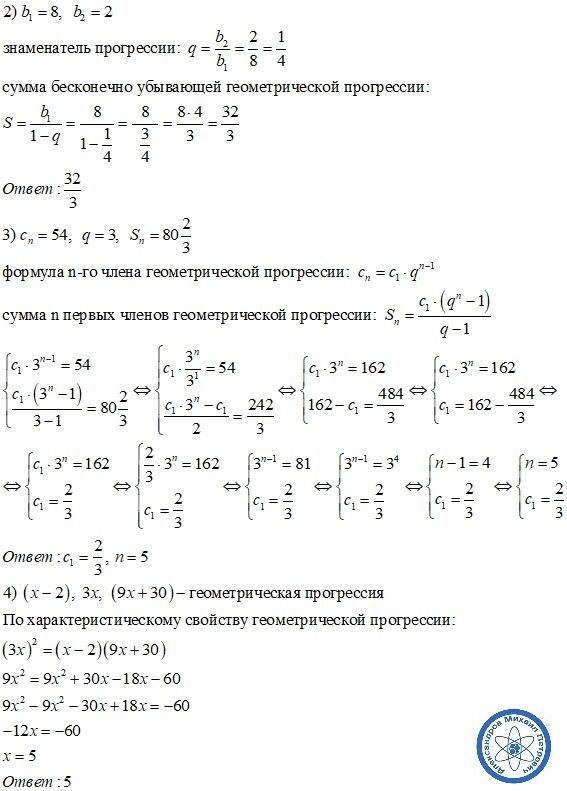 2. Найти сумму бесконечной прогрессии 8; 2; 0,5 … 3. В геометрической прогрессии сn=54, q=3, Sn=80 ⅔ . Найти с1 и n. 4. Найти х, при которых числа (х-2), 3х и (9х+30) составляют геометрическую прогрессию.
