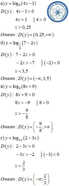 Найти область определения функцииа)y=log6(4x-1)б)y=log одна девятая (7-2x)в)y=log9(8x+9)г) y=log0.3(2-3x)