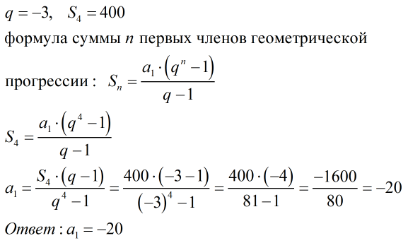 Найдите первый член геометрической прогрессии (an), в которой g=-3,s4=400.