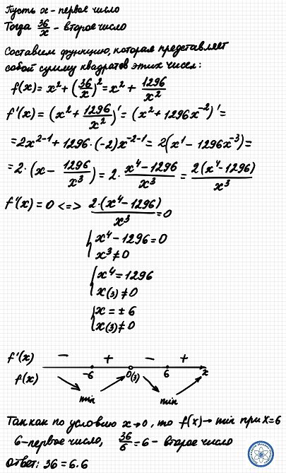 Представьте число 36 в виде произведения двух положительных чисел так , чтобы сумма квадратов этих чисел была минимальная