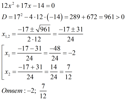 Найдите наибольший корень уравнения 12x^2+17x-14=0