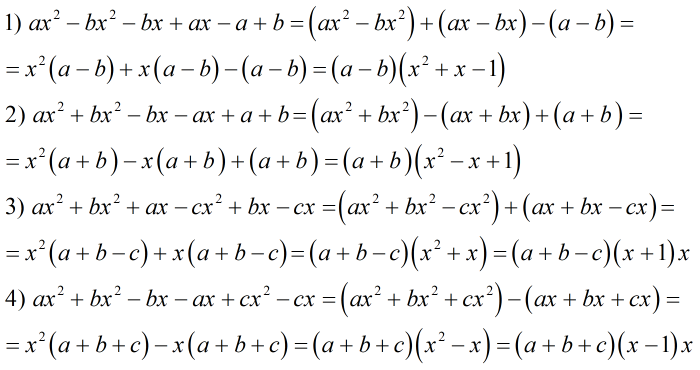 Представьте многочлен в виде произвидения: 1.ах²-bx²-bx+ax-a+b 2.ax²+bx²-bx-ax+a+b 3.ax²+bx²+ax-cx²+bx-cx 4.ax²+bx²-bx-ax+cx²-cx