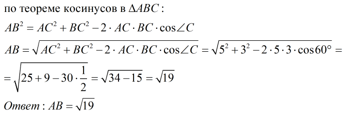 Найти сторону ab треугольника abc, если BC=3см, AC=5см, угол C=60 градусов