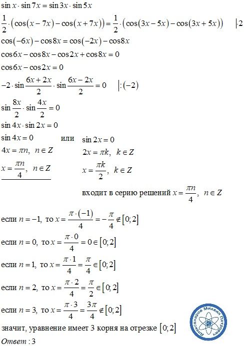 Сколько корней имеет уравнение sin x • sin 7x = sin 3x • sin 5x, если x €[0;2]