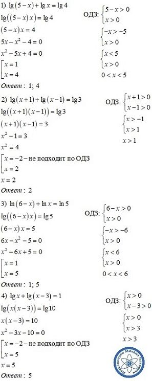 1) lg (5-x)+lgx=lg4; 2) lg (x+1)+lg(x-1)=lg3; 3) ln (6-x)+lnx=ln5; 4) lgx+lg (x-3)=1
