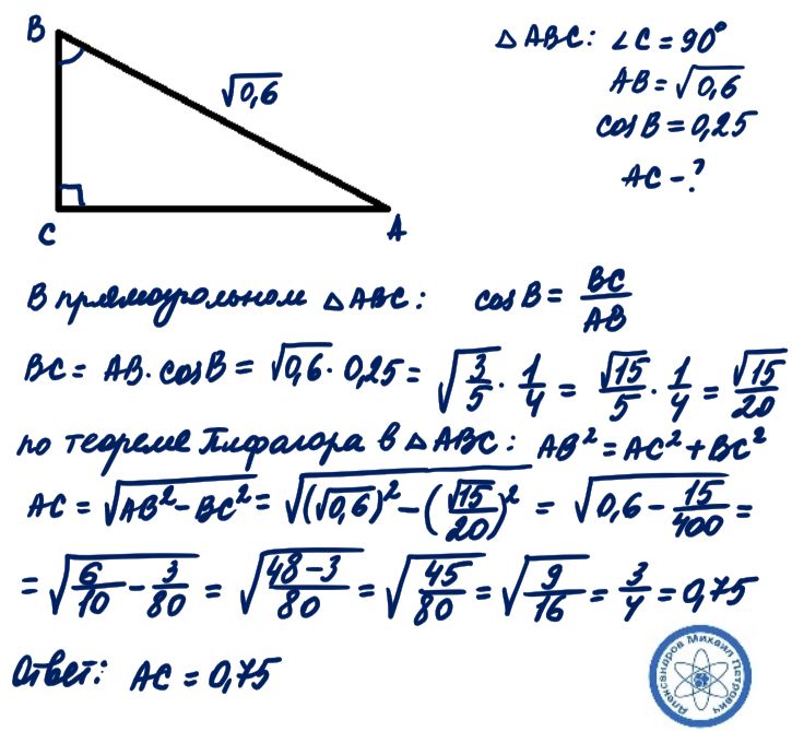 В треугольнике abc угол c = 90 , ab=корень из 0,6. cos угла B=0,25 найти AC
