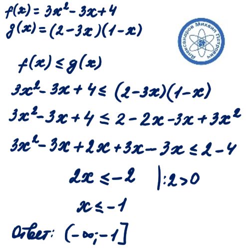 При каких значениях переменной x график функции f(x)=3x^2-3x+4 расположен не выше, чем график функции g(x)=(2-3x)(1-x)?