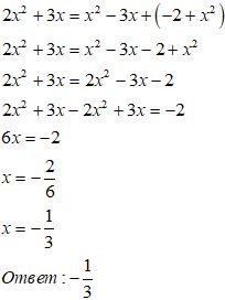 Решить уравнение 2х^2+3х=х^2-3х+(-2+х^2)