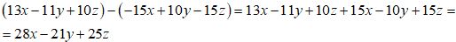Найдите алгебраическую сумму многочленов (13x-11y+10z)-(-15x+10y-15z)