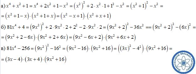 Представьте в виде произведения многочленов: а) х⁴+х²+1 б) 81х⁴+4 в) 81х⁴-256