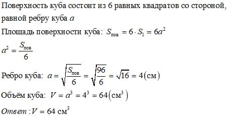 Найдите объем куба,если площадь его поверхности равна 96см2