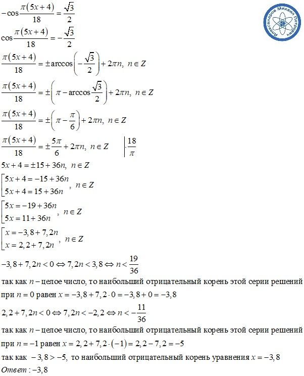 Найти наибольший отрицательный корень -cos П (5x+4) дробь 18 =корень из 3 два