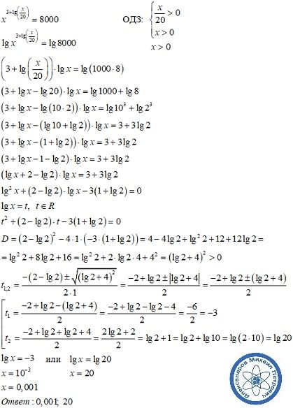 Х в степени 3+lg(х/20)= 8000 решить уравнение