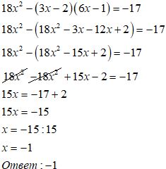 Уравнение: 18x во второй-(3x-2)(6x-1)= -17