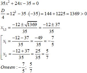 Решите уравнение 35х^2+24х-35=0
