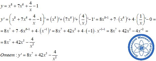 Найти производную: 1) y=x^8+7x^6+4/x-1