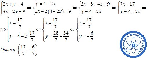 Решить систему уравнений 2х+у=4 3х-2у=9