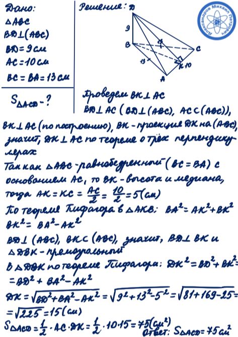 Прямая BD перпендикулярна к плоскости треугольника ABC. известно, что BD=9 см, AС = 10 см, BC=BA=13 см. Найти площадь треугольника ACD.