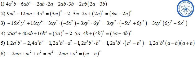 Представьте выражение в виде произведения: 1. 4a^2b-6ab^2 2. 9m^2-12mn+4n^2 3. -15x^3y^2+18xy^4 4. 25a^2+40ab+16b^2 5. 1,2a^5b^3-2,4a^3b^5 6. -2mn+m^2+n^2