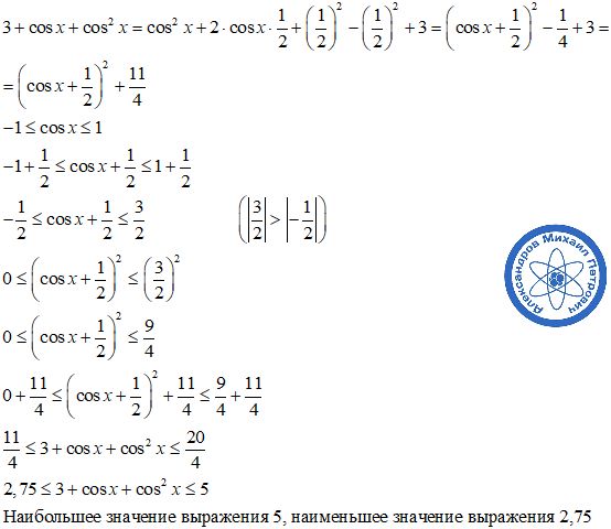 Наибольшее и наименьшее значения выражения 3 + cos(x) + cos^2(x)