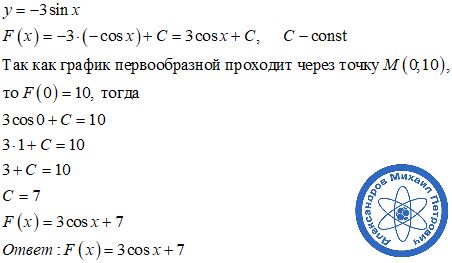Для функции y=-3sinx найдите первообразную , график которой подходит через точку M(0;10)