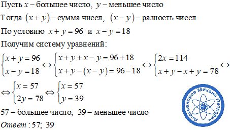 Сумма двух чисел 96 а разгость 18 найдите эти числа