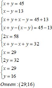 Решите систему уравнений методом алгебраического сложения x+y=45 x-y=13