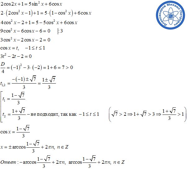 Решите уравнение 2cos2x+1=5sin^2x+6cosx