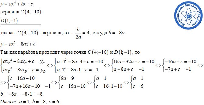 Парабола y=ax2+bx+c имеет вершину в точке C(4;-10) и проходит через точку D(1;-1). Найдите значения коэффициентов a, b и c