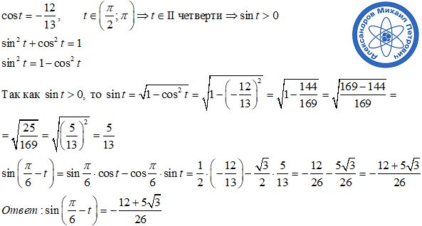 Известно,cos t =-12/13,tе(п/2:п).Найти sin(п/6-t)