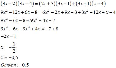 Решите уравнение (3x+2)(3x-4)=(2x+3)(3x-1)+(3x+1)(x-4)
