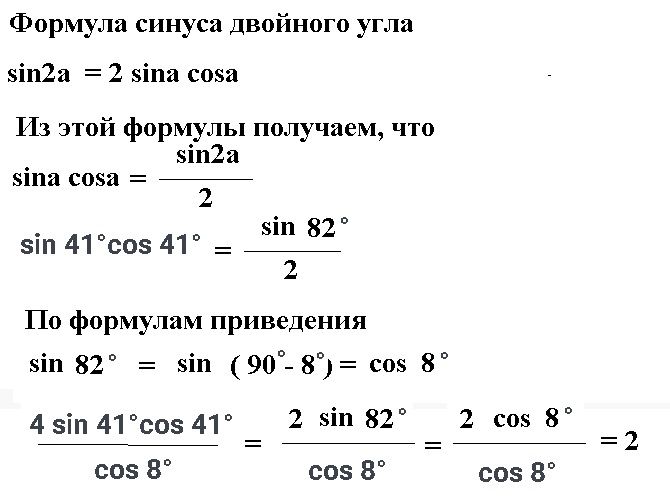 = 2 * 2sin41°cos41° / cos8° (разделить числитель и знаменатель на 2)
